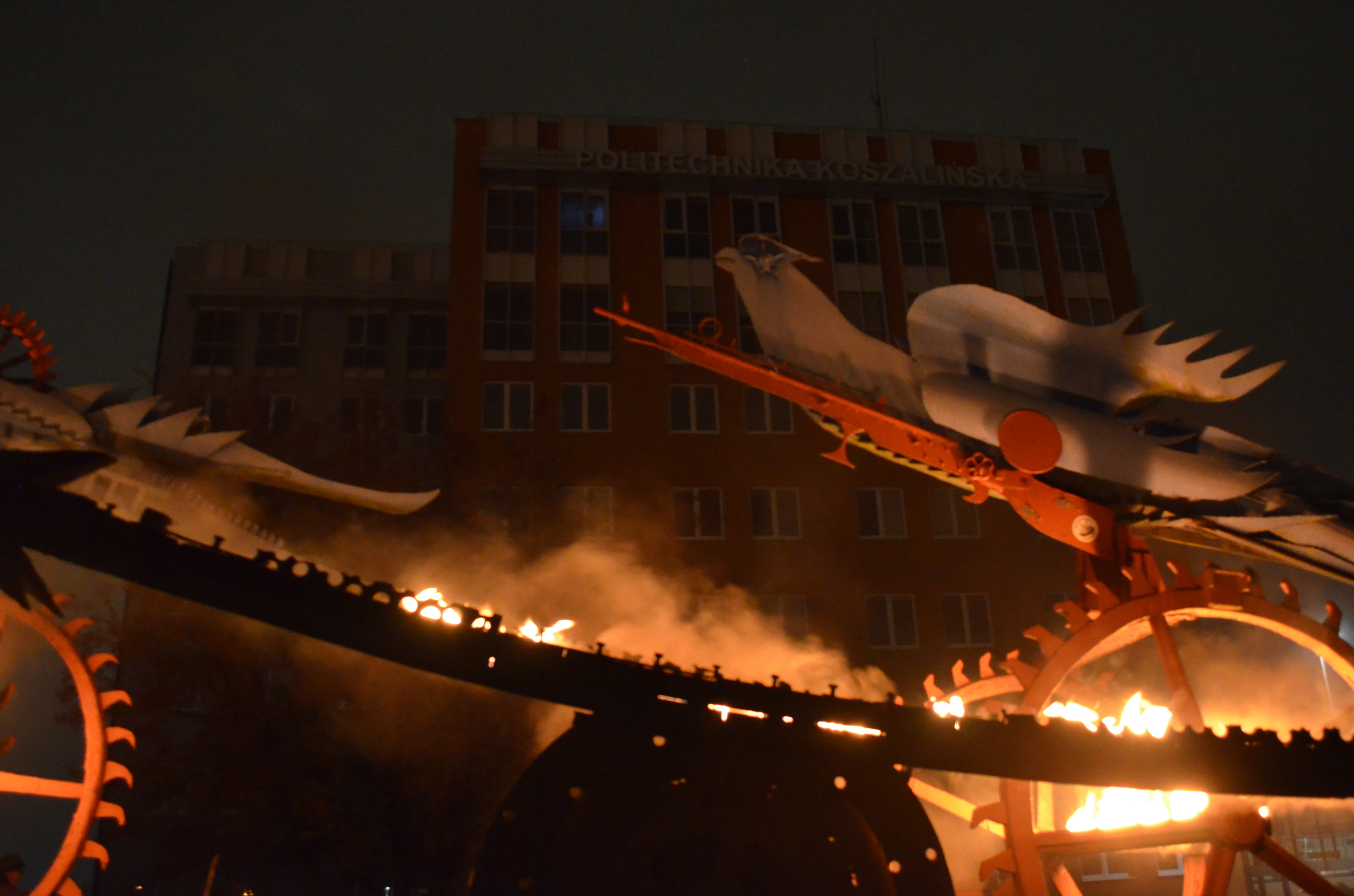 W Koszalinie w dniu 11 listopada 2025 roku przy pomniku Płonące Ptaki, Władysława Hasiora, dla uczczenia Narodowego Święta Niepodległości, odbyło się widowisko z patriotyczne. Licznie zgromadzeni widzowie mogli podziwiać artystyczne popisy Teatru Ognia w wykonaniu grupy Jump Fire, a pięciostrzałowy salut artyleryjski dla Niepodległej oddała Najemna Rota Strzelcza z Okonka. Następnie przy dźwiękach harcerskiej pieśni "Płonie ognisko w lesie" i patriotycznej "Roty" rekonstruktorzy z BSMH Perun i SRH Gryf oraz harcerze z Hufca ZHP Ziemi Koszalińskiej zapalili białoczerwone pochodnie oraz Płonące Ptaki.